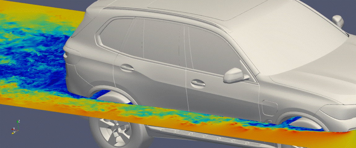 Fluctuations du champ de vitesse autour d’un véhicule, obtenues avec un logiciel de mécanique des fluides, utilisant la méthode Lattice Boltzmann avec un modèle LES.